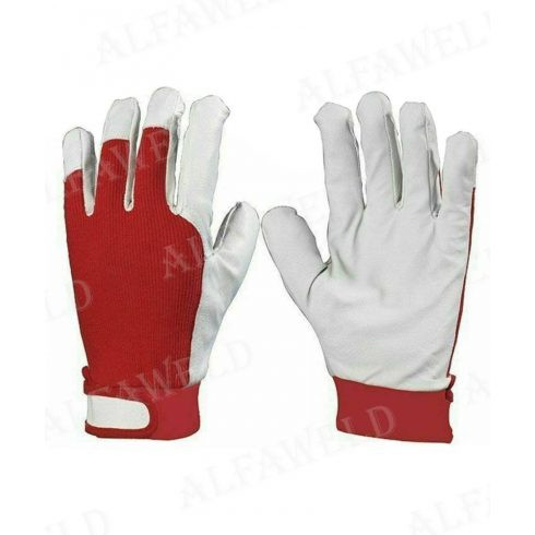 Puha színsertésbőr sofőrkesztyű piros pamut kézháttal, tépőzárral.